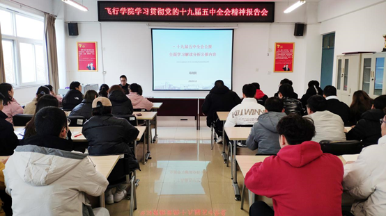 12月17日下午,飞行学院举办学习贯彻十九届五中全会精神报告会,党总支书记冯利民作专题报告,飞行学院学生党员、学生干部40余人参加学习。马克思主义学院领导班子成员到现场进行旁听。