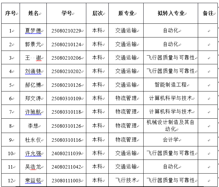 按照《安阳工学院关于印发<学生转专业管理办法>的通知》等文件精神,我院受理了转专业学生的书面申请,对申请转专业学生进行了全面考察。经学院研究决定,现将拟同意转专业学生的信息公示如下,公示期3个工作日,若有异议请向学院反映。(公示结束后,学院将按照学校统一规定办理转专业手续)。